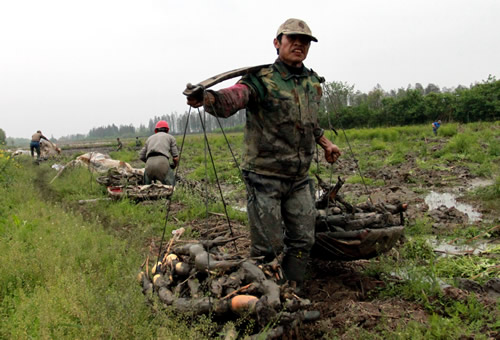 工人正在辛勤劳动着,莲藕全部人工挖取